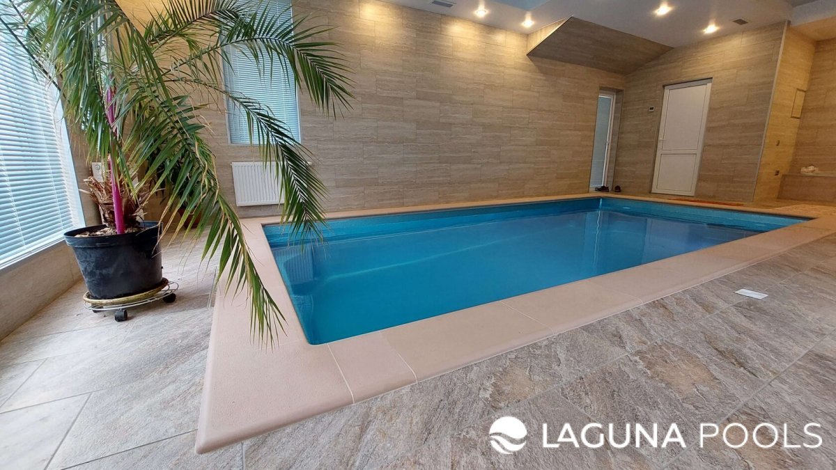 Композитный бассейн расположен в помещении с бежево-серой плиткой и точечным освещением.