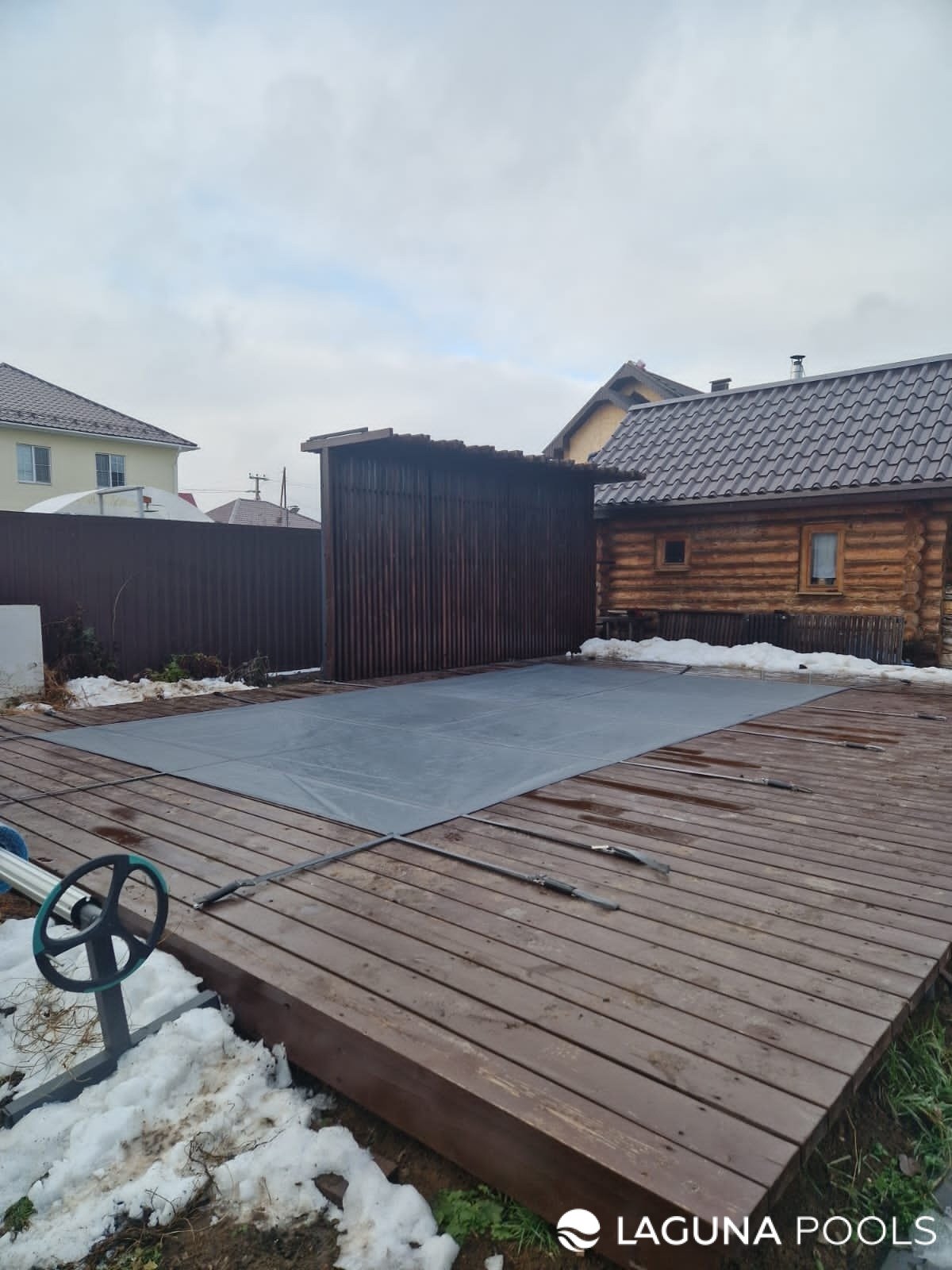 Композитный бассейн с защитным тентом на террасе из темного дерева около деревянного сруба